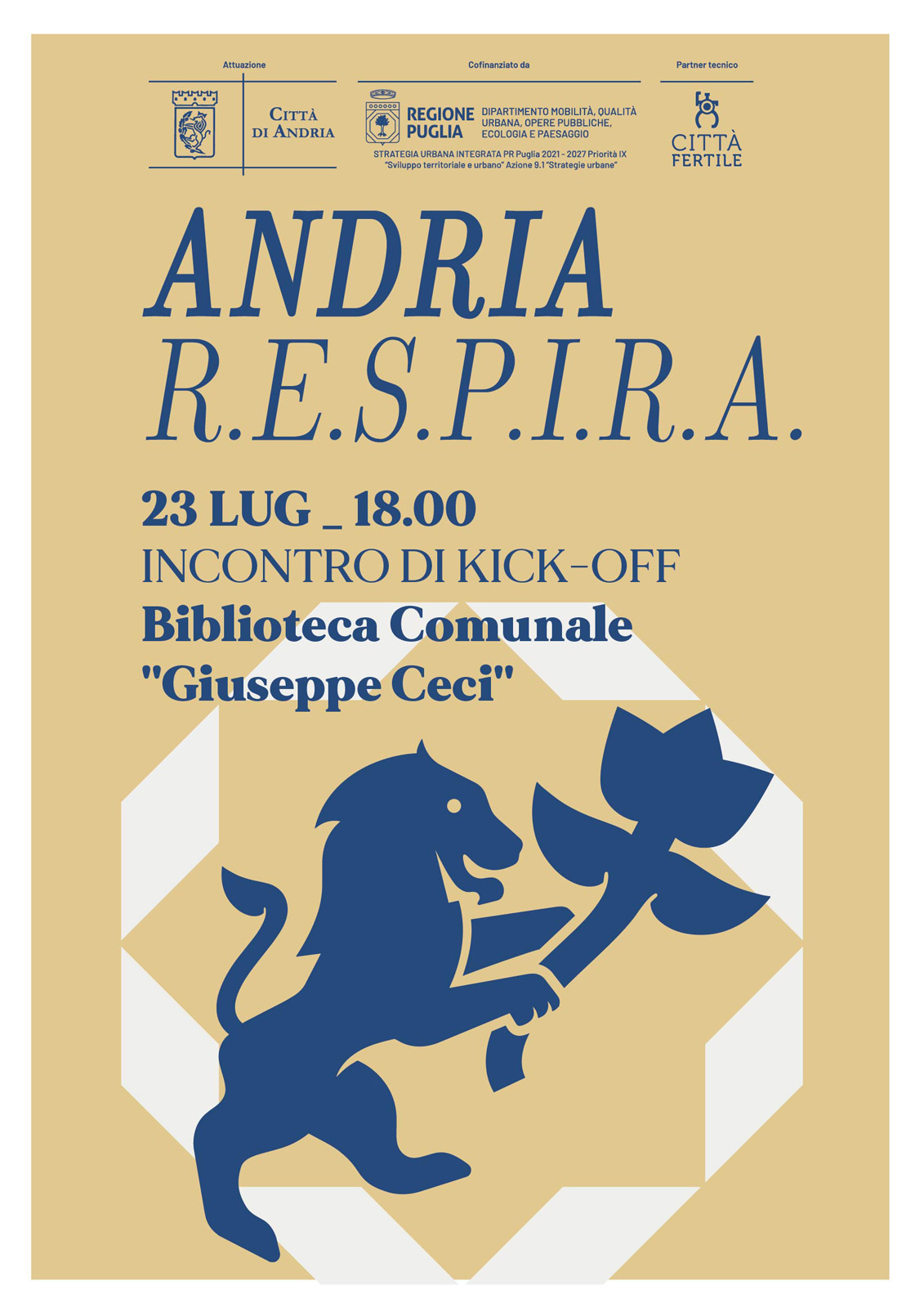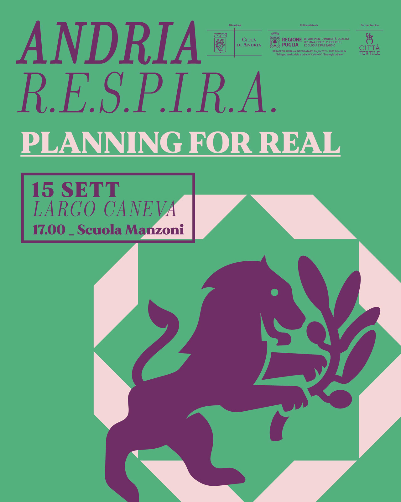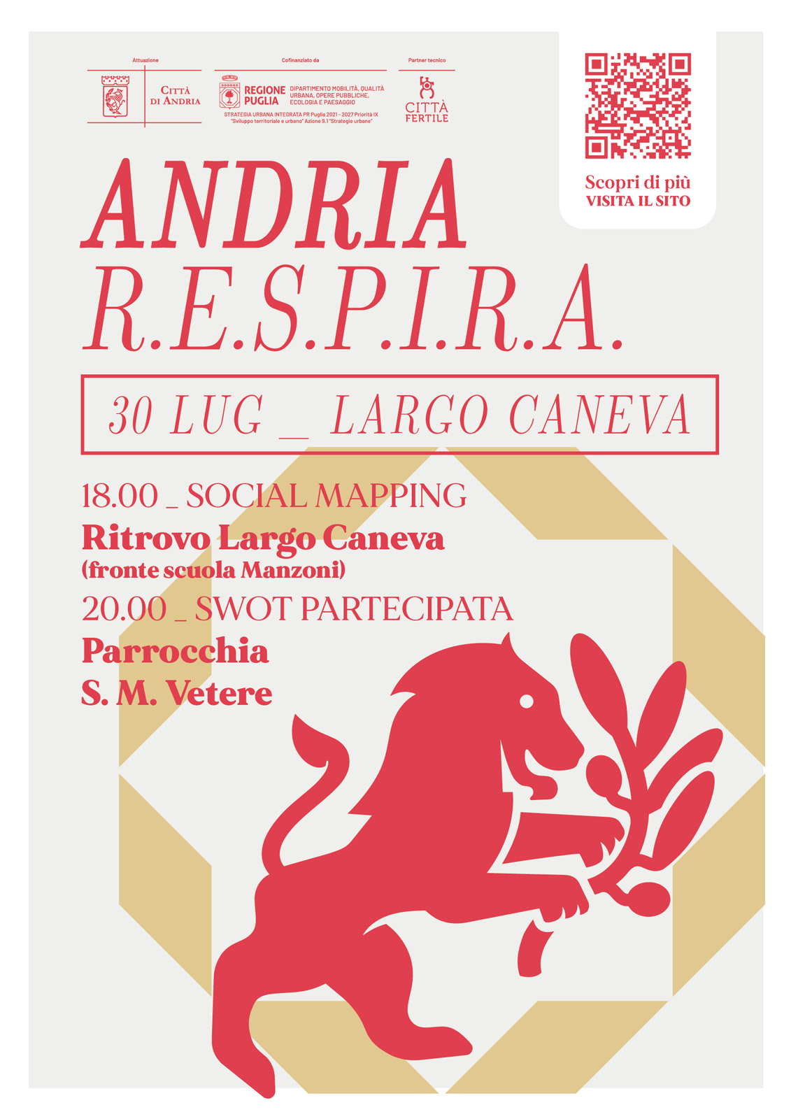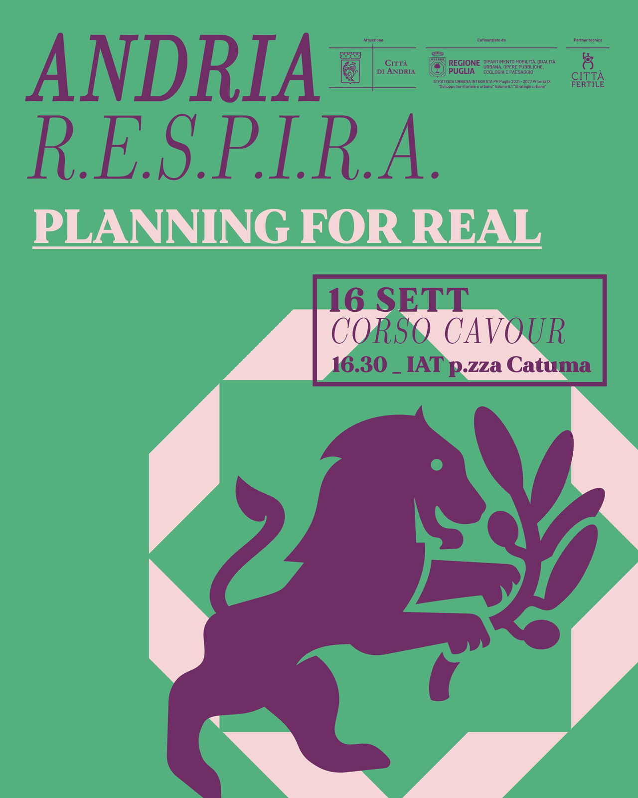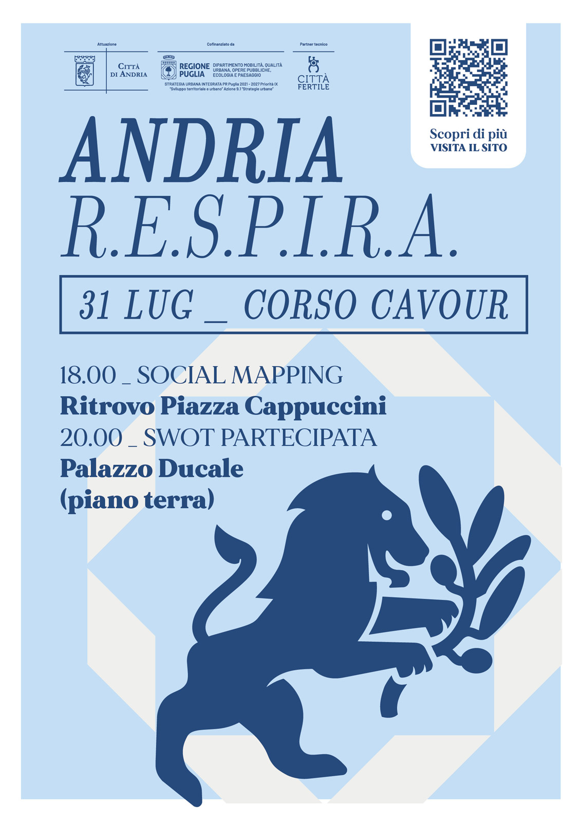 Un percorso di progettazione urbana partecipata avviato dal Comune di Andria al fine di rigenerare due spazi pubblici rilevanti del tessuto urbano tramite un’unica strategia. La strategia Andria R.E.S.P.I.R.A.(Riqualificazione, Energia, Sostenibilità, Pedonabilità, Infrastrutture verdi, Rinaturalizzazione, qualità dell’Aria) vuole rimettere al centro la qualità ambientale del tessuto urbano per attivare dei processi di crescita ed inclusione sociale e si concentra in particolare su due interventi specifici: