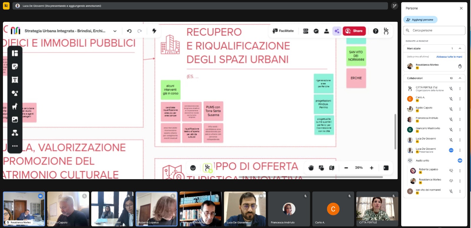 Il laboratorio si è tenuto simultaneamente a Brindisi, Erchie e San Vito dei Normanni: i tre Comuni hanno lavorato in parallelo o insieme in momenti digitali di plenaria per la costruzione di visioni aggregate sulla rigenerazione di immobili pubblici, spazi urbani, valorizzazione del patrimonio e offerta turistica.